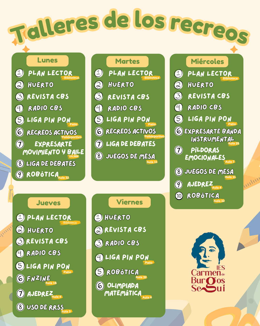 Nuestro centro está comprometido con los recreos activos, para ello, los docentes han organizado diferentes talleres de diversa temática. Os dejamos la oferta a continuación.